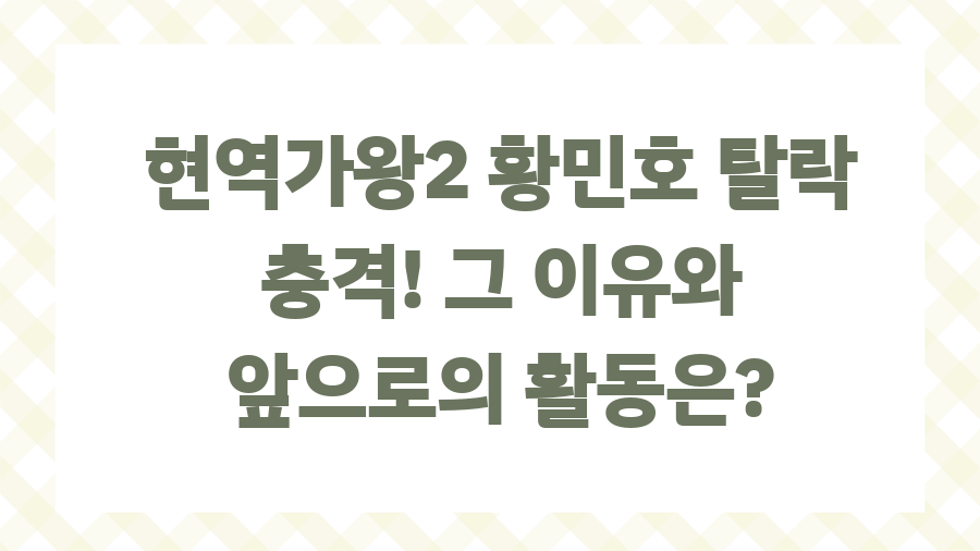 대한민국을 사로잡은 '현역가왕2'의 돌풍, 기억하시나요? 매주 엄청난 화제를 몰고 다녔던 무대들, 그리고 예측불허의 결과들… 그 중에서도 많은 이들을 놀라게 했던 황민호 참가자의 탈락 소식은 단연 가장 큰 충격이었죠. 이번 포스팅에서는 황민호 탈락의 이유와 그 의미를 다각적으로 분석해보고, 앞으로 그의 활동에 대한 전망까지 함께 살펴보도록 하겠습니다. 과연 무엇이 그를 무대에서 내려놓게 했을까요? 함께 궁금증을 풀어보아요.