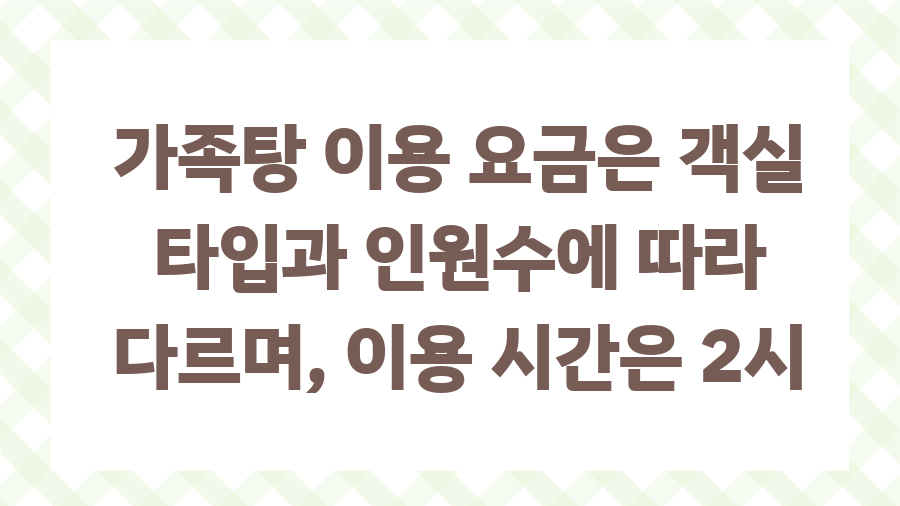 가족탕 이용 요금은 객실 타입과 인원수에 따라 다르며, 이용 시간은 2시간에서 3시간까지 제공됩니다. 특히, 어린이 동반 가족에게는 잊지 못할 추억을 선사할 것입니다.