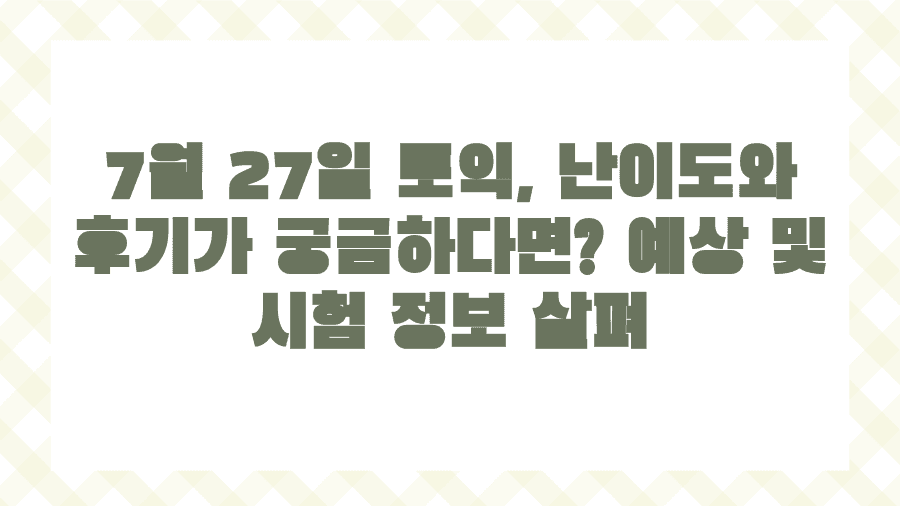 A2. 7월 27일 토익 시험의 정확한 난이도를 미리 알 수는 없지만, 이전 시험들의 후기들을 참고하는 것이 도움이 됩니다. 토익 커뮤니티, 스터디 그룹, 시험 후기 블로그 등에서 파트별 난이도, 자주 출제된 유형, 체감 난이도 등에 대한 정보를 얻을 수 있습니다. 토익 모의고사를 실제 시험처럼 풀어보며 자신의 실력을 객관적으로 평가하고, 약점을 파악하는 것이 난이도 대비 전략을 세우는 데 더 효과적입니다.