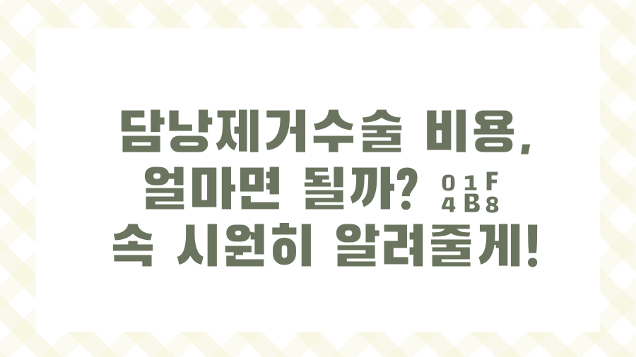 담낭제거수술, 혹시 고민하고 계신가요?담낭, 우리 몸에서 쓸개라고도 불리는 이 작은 주머니는 소화에 중요한 역할을 담당합니다.하지만 담석이나 염증 같은 문제가 생기면 극심한 통증을 유발하고, 심할 경우 수술까지 고려해야 하죠.수술을 결정하기 전 가장 궁금한 것 중 하나는 바로 "비용"일 텐데요.담낭제거수술 비용은 어떤 요인에 따라 달라지는지, 그리고 어떤 수술 방법이 있는지 꼼꼼하게 알아보고, 현명한 선택을 할 수 있도록 도와드리겠습니다.이 글을 통해 담낭제거수술에 대한 궁금증을 해소하고, 마음 편히 치료에 집중할 수 있기를 바랍니다.담낭절제술, 과연 얼마일까?담낭제거수술, 즉 담낭절제술 비용은 여러 요인에 따라 천차만별입니다.수술 방법, 병원 종류, 입원 기간 등에 따라 비용이 크게 달라질 수 있다는 ..