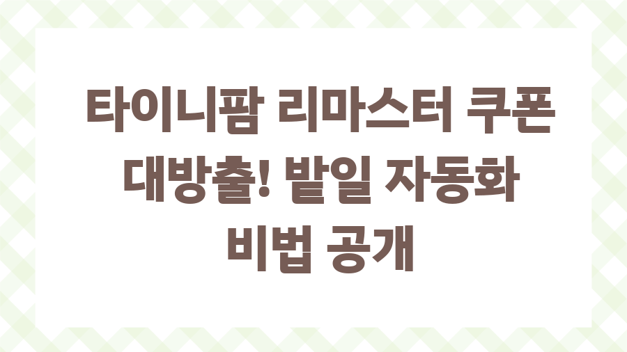 타이니팜 리마스터,쿠폰으로 밭일 자동화?! 혹시 어릴 적 타이니팜에 푹 빠져 밤새도록 밭을 일구던 추억,다들 있으신가요?추억의 게임이 리마스터되어 돌아왔다는 소식에 에디터도 설레는 마음 감출 수 없었는데요!오늘은 타이니팜 리마스터를 더욱 풍족하게 즐길 수 있는 꿀팁,바로 쿠폰 정보를 들고 왔습니다.무과금 유저도 걱정 없이 풍족한 농장을 만들 수 있도록,지금부터 타이니팜 리마스터 쿠폰의 모든 것을 파헤쳐 볼까요? 타이니팜 리마스터, 왜 쿠폰을 챙겨야 할까요?타이니팜 리마스터에서 쿠폰은 단순히 '공짜' 아이템을 얻는 수단이 아닙니다.초반 성장을 가속화하고, 게임을 더욱 풍성하게 즐길 수 있도록 돕는 마법과 같은 존재죠!특히 무과금 유저라면 쿠폰을 통해 얻는 재화와 아이템은 단비와 같습니다. 레벨 업 속도 U..